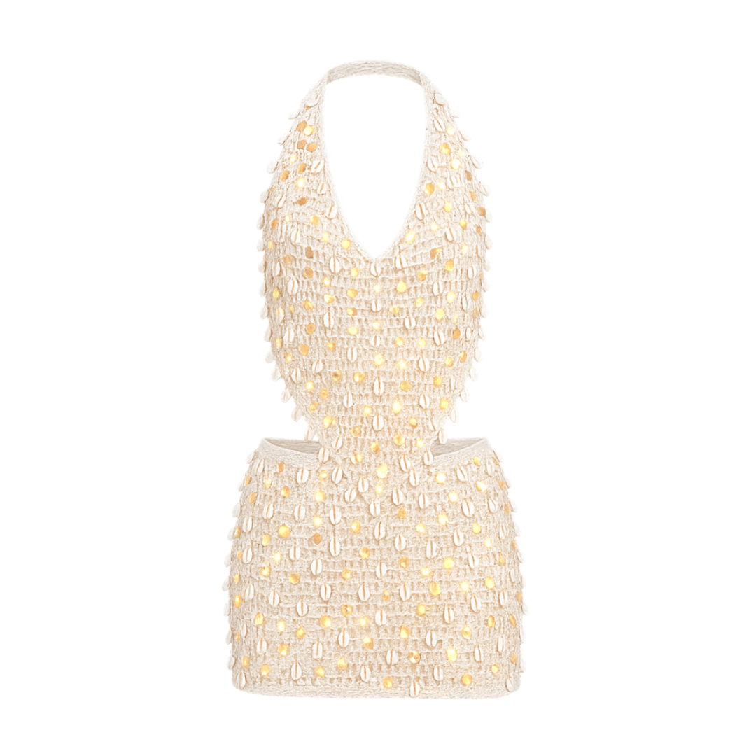 Handcrafted with intricate crochet detailing, this two-piece set features a halter-style top with a flattering V-neckline and a mini skirt designed to highlight the natural silhouette. Both pieces are delicately adorned with shells and golden sequins, shimmering with every movement like sunlight on the sea.