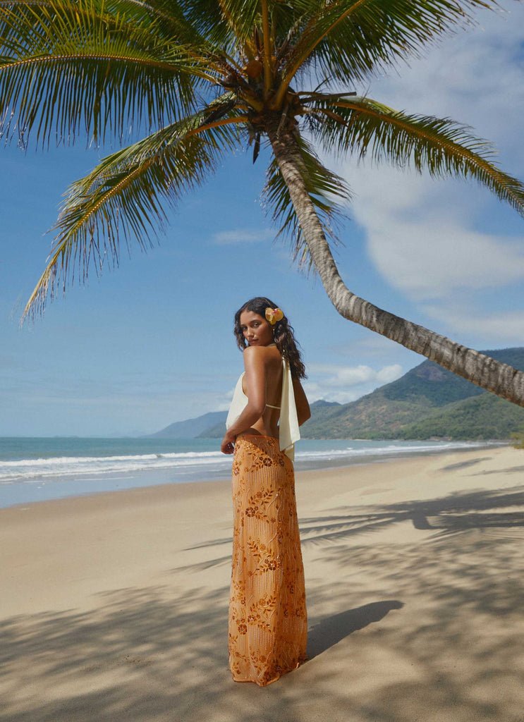 The high-waisted fit flatters the natural curves, while the smooth inner lining ensures comfort without compromising on sophistication. Each piece is a work of craftsmanship, with delicate tonal beading that evokes the charm of summer evenings and glowing horizons.