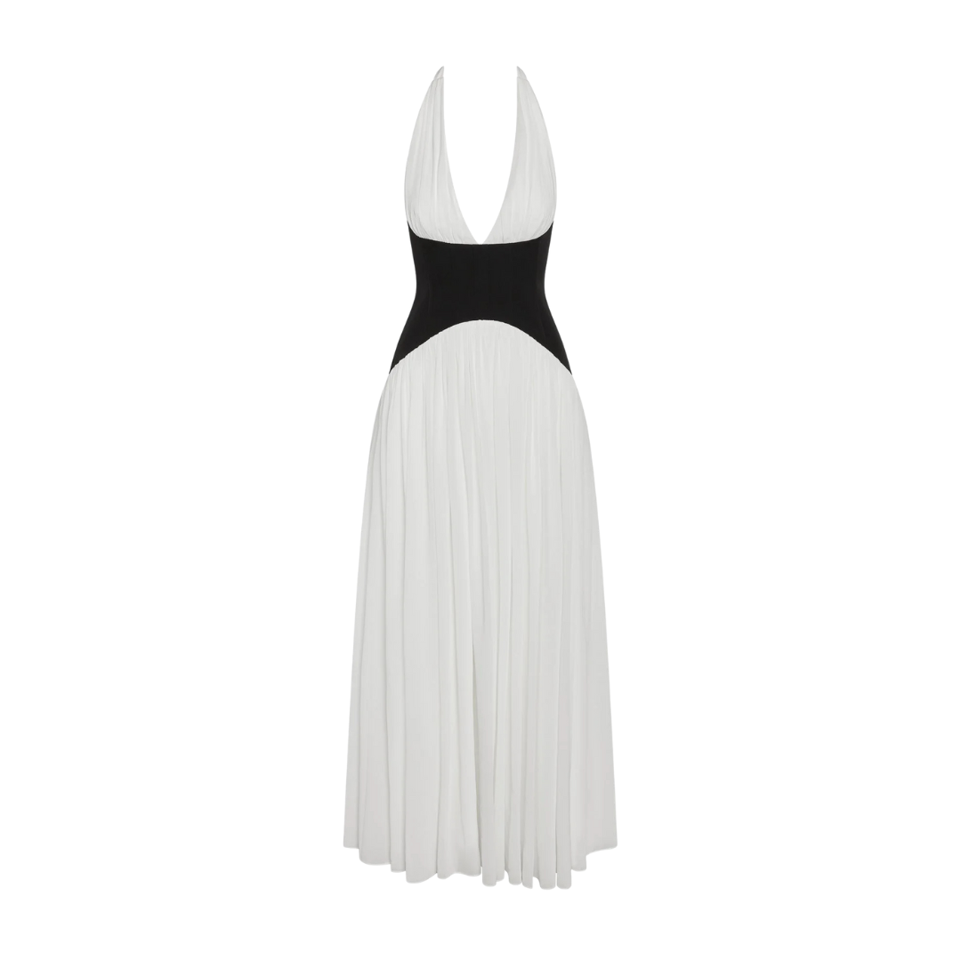 This ethereal white maxi dress features a halter neckline delicately gathered across the bust, creating a soft, flowing drape that flatters every silhouette. The contrast black corset waistline, structured with vertical boning, cinches the waist to sculpt and define your figure while adding a striking, contemporary edge. The flowing skirt moves gracefully with every step, balancing elegance with ease.