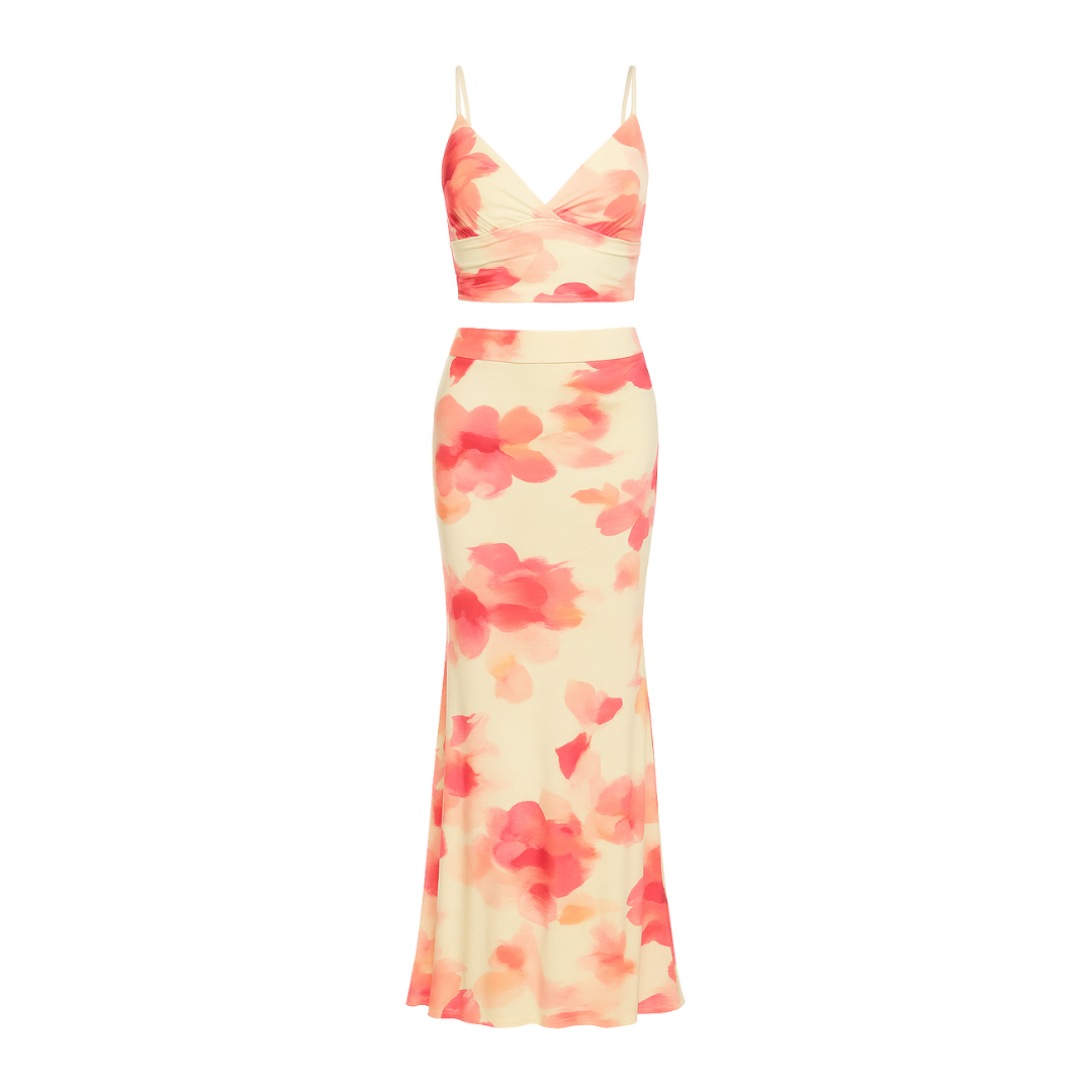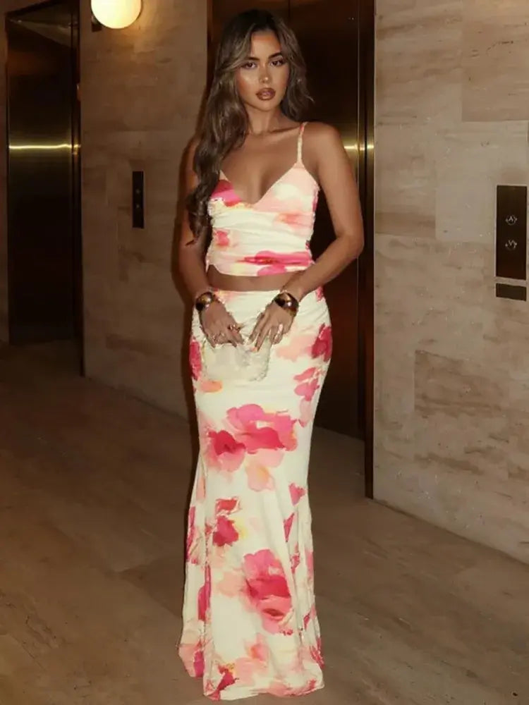 Crafted from a soft spandex / polyester blend, this two-piece features a fitted crop top with delicate straps and a high-waisted maxi skirt that drapes beautifully along the silhouette. The ruched detailing accentuates curves while ensuring comfort and flexibility.